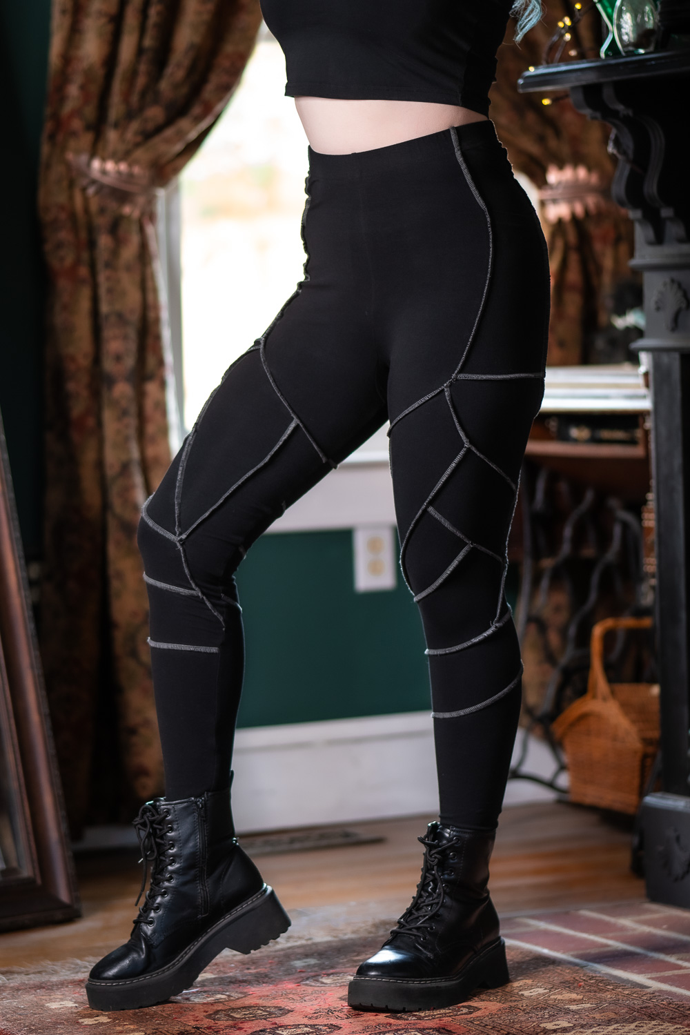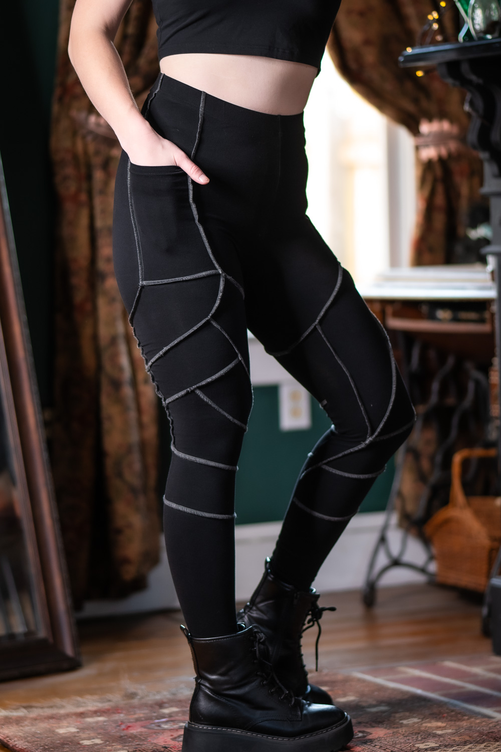 If you've been on the hunt for soft and comfortable leggings to take with you anywhere, look no further than the Elven Blade Leggings. Originally released in 2021, we've spent 2 years refining the design to bring them back better than ever - now with upgraded thick cotton stretch fabric, reinforced stitching, and thigh pockets big enough for any size phone. With contrasting gray serger stitches in an elvish armor inspired pattern, they were made to complement a number of items in the Dark Cottage Collection.