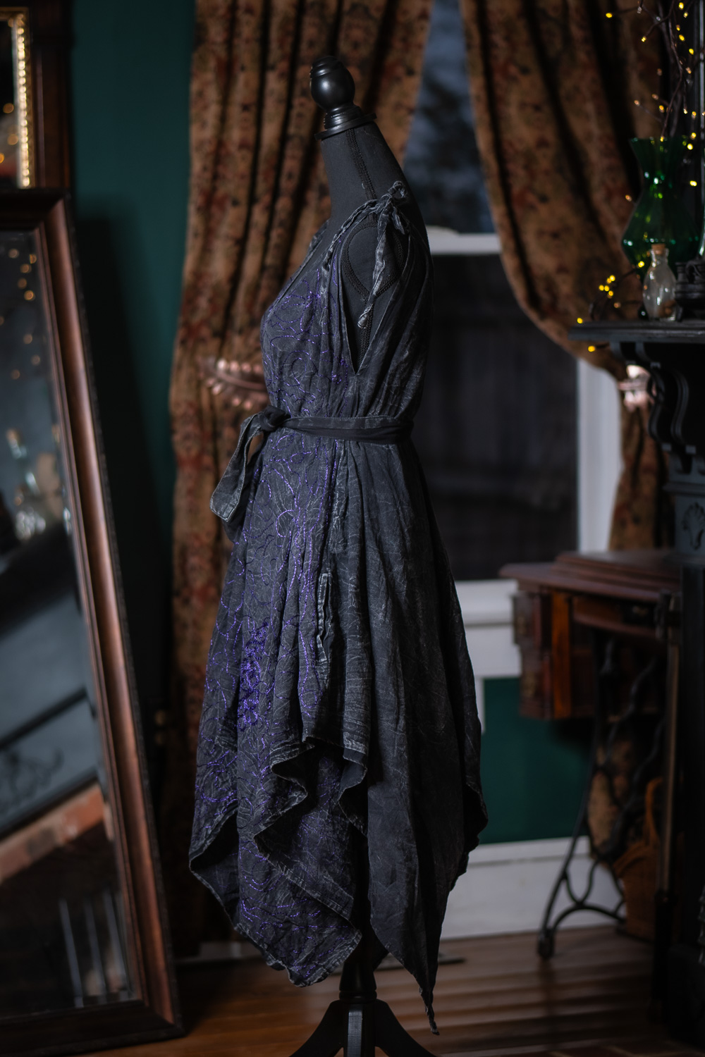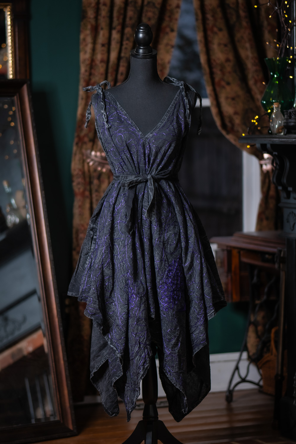 These Morrigan Apron Dresses are from a previous batch of dresses with metallic thread. There may be minor imperfections and loose threading.