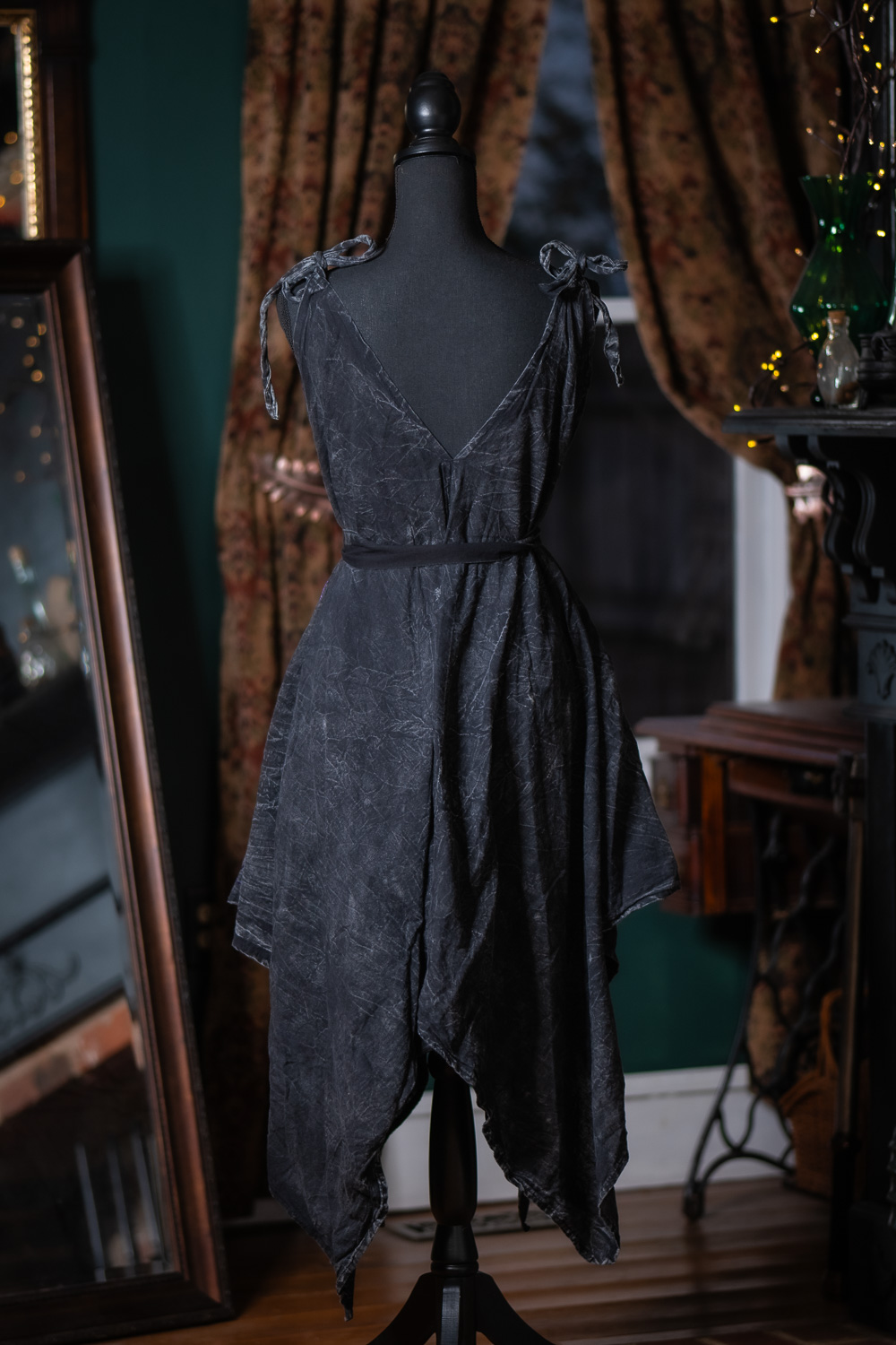 The Morrigan Apron Dress is a soft, stonewashed cotton tie on dress inspired by natural dark cottagecore style with Celtic roots. An intricate pattern of swirling forest green embroidery comes together and surrounds the Tree of Life on one half of the dress, creating a balanced yet asymmetric style that complements the handkerchief hem. This dress is oversized and designed to flatter a variety of body types, with shoulder straps that hand tie for adjustability. The waist belt is a detached long piece of fabric so you can wear it any way you choose, whether it be as a belt or matching hair accessory. The Morrigan Apron Dress is hand dyed and stonewashed that gives the fabric a worn in look and feel, and dye pattern may vary.