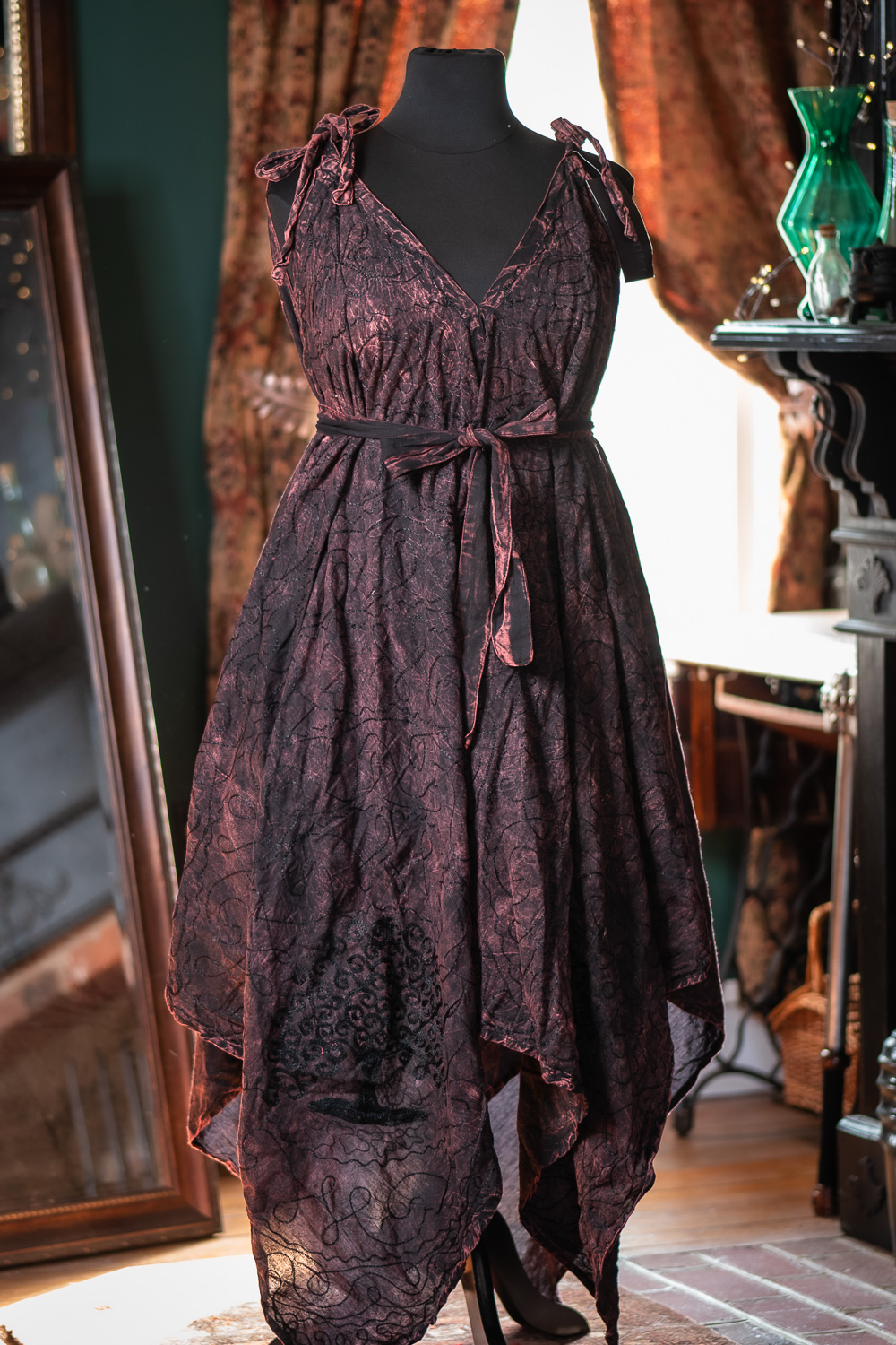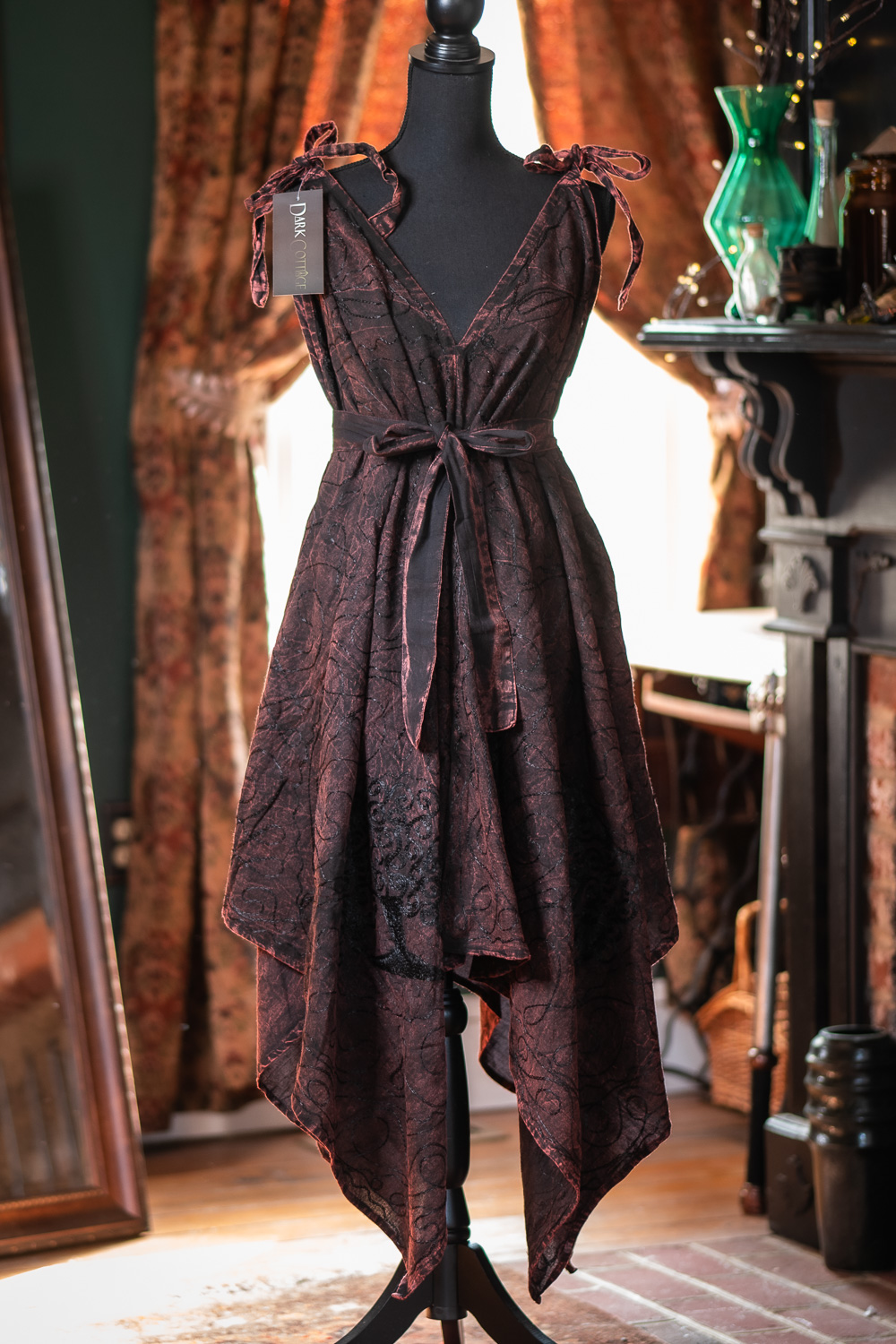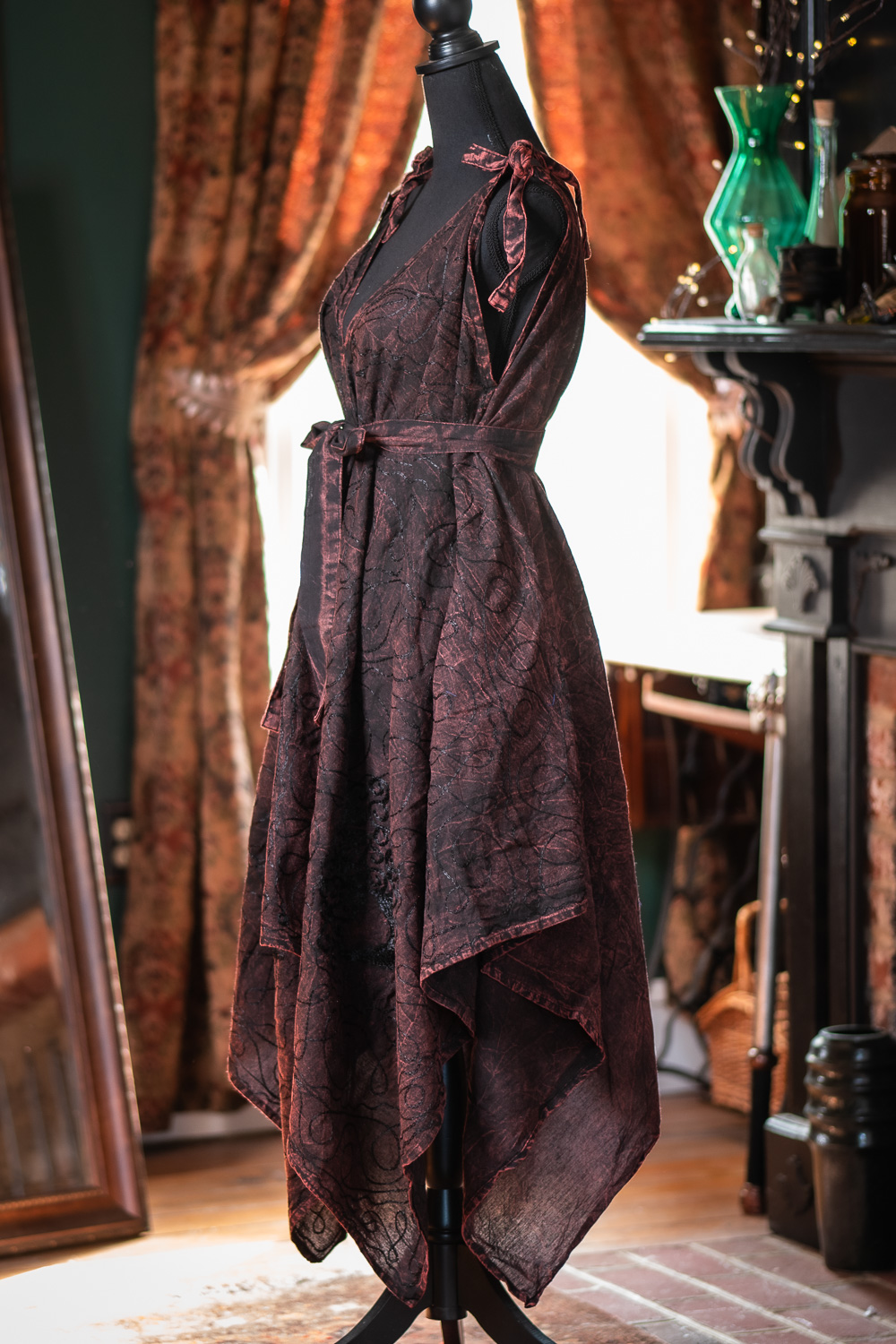 These Morrigan Apron Dresses are from a previous batch of dresses with metallic thread. There may be minor imperfections and loose threading.
