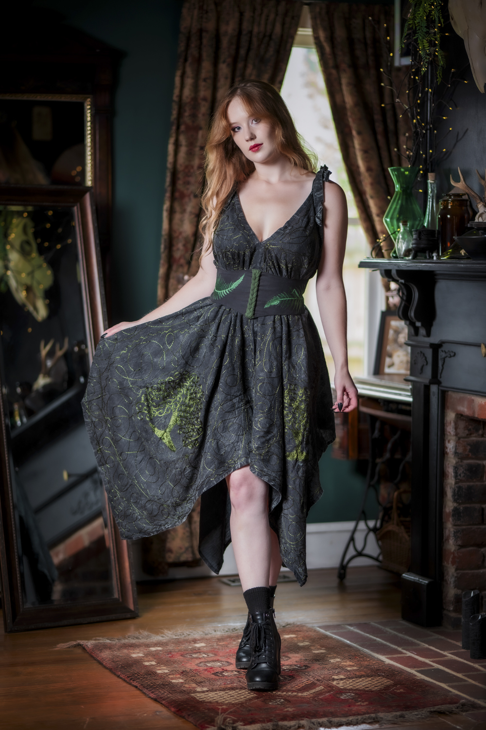 The Morrigan Apron Dress is a soft, stonewashed cotton tie on dress inspired by natural dark cottagecore style with Celtic roots. An intricate pattern of swirling forest green embroidery comes together and surrounds the Tree of Life on one half of the dress, creating a balanced yet asymmetric style that complements the handkerchief hem. This dress is oversized and designed to flatter a variety of body types, with shoulder straps that hand tie for adjustability. The waist belt is a detached long piece of fabric so you can wear it any way you choose, whether it be as a belt or matching hair accessory. The Morrigan Apron Dress is hand dyed and stonewashed that gives the fabric a worn in look and feel, and dye pattern may vary.