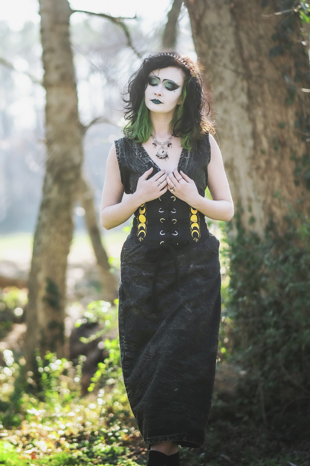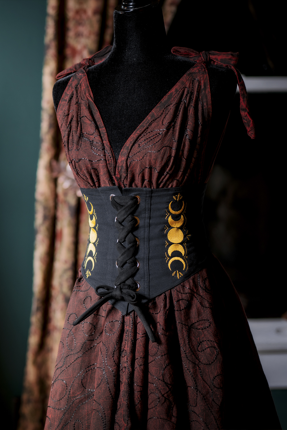 Inspired by vintage stays and renaissance corsets, the Selene Corset Belt takes the best of both to make a comfortable everyday waist accessory. Stonewashed cotton fabric gives this belt a worn medieval feel and the look of linen without the cost, with an extra wide faux suede ribbon and tapered shape. The original moon embroidery design draws inspiration from the triple moon and moon goddess Selene.
