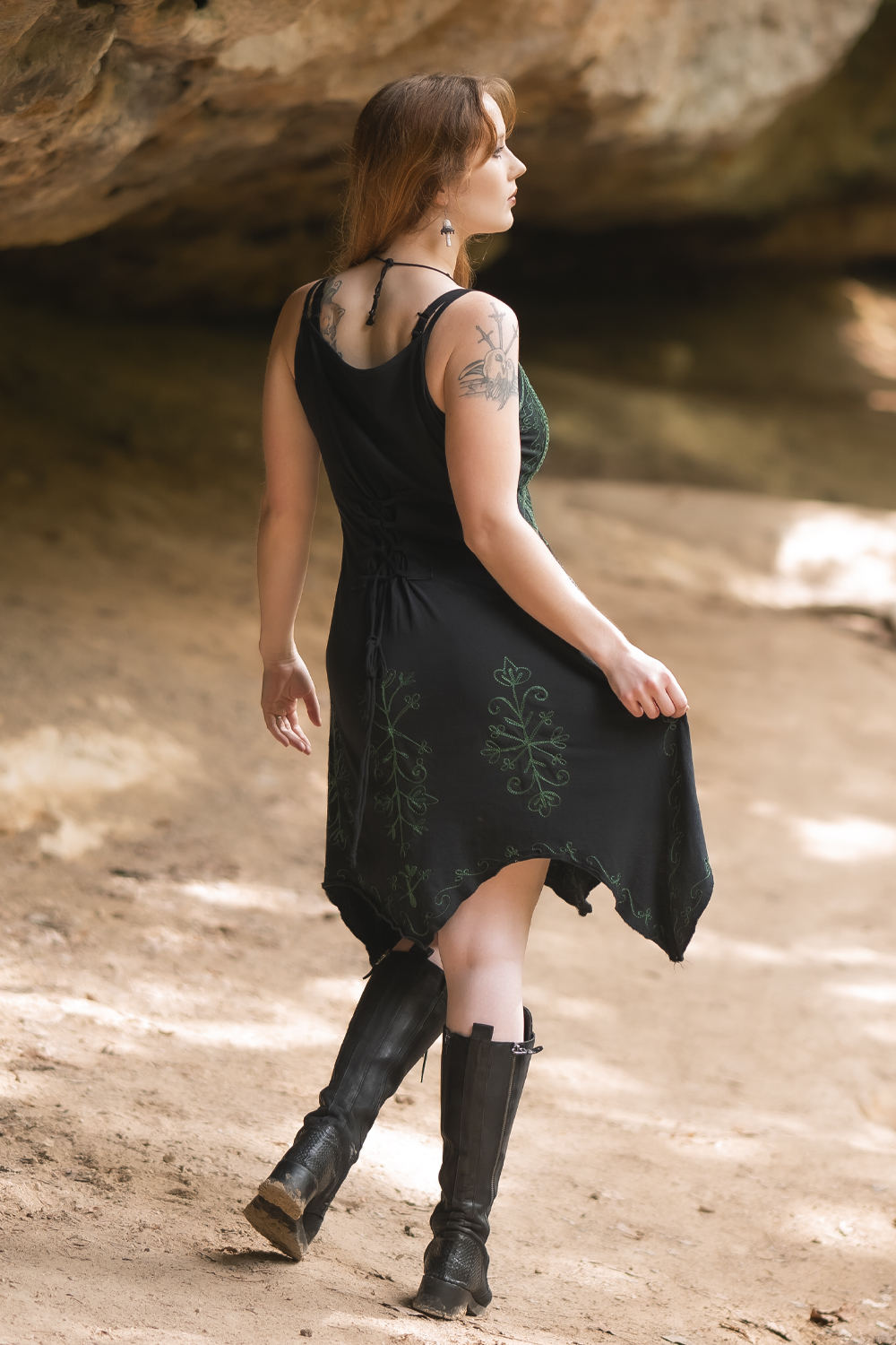 The Sirona Dress embodies the spirit of the ancient goddess of healing springs, blending flowing lines and nature-inspired details into a look as tranquil as it is powerful. Inspired by the essence of sacred waters and forest groves, this dress features intricate green embroidery reminiscent of plant life flourishing near hidden springs. Its soft, graceful silhouette and handkerchief hem move like water, creating a serene elegance that flows with each step. A delicate lace-up neckline brings a sense of ritual adornment, while the deep black fabric feels like a night cloaked in mystery. Wear the Sirona Dress to channel the calm strength and wisdom of the goddess herself, whether you're exploring woodland paths or finding quiet moments for inner reflection. Designed to pair perfectly with the Sirona Maxi Skirt to add length and layers to the look.